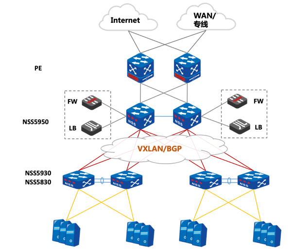 NSS5950-04C可轻松实现基于高密度接入点的部署和极简组网的要求,可大幅提升接入和汇聚能力,精简组网层级和组网设备数量规模,为园区网带来前所未有的便捷与高效。凭借其高性能与高密度特性,成为数据中心汇聚层与核心层的理想选择,可实现数据中心盒盒组网架构组网。相较于传统框盒组网方案,大幅降低数据中心组网复杂度,并进一步降低时延。
