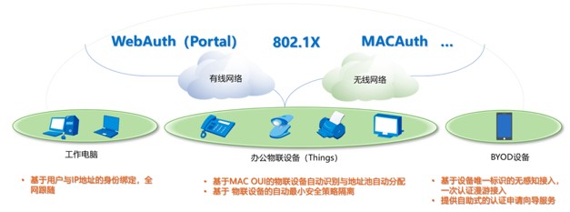 基于SDN的园区网统一和融合802.1x、WebAuth(与有线无线统一同时支持)、MacAuth多种认证方式,为园区网络中的各类办公、物联、BYOD设备提供更安全和便捷的AnyConnet接入方案。启用安全接入模块,并采用强密码或证书认证,避免非法的客户端、设备接入网络,可有效预防非法终端带来的破坏。