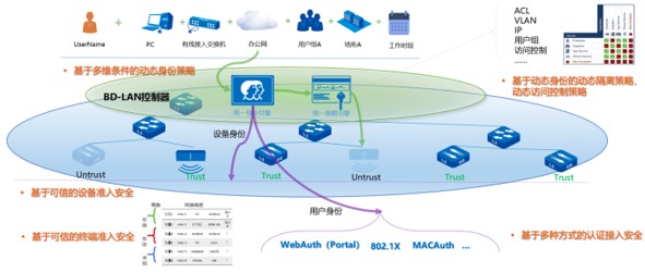 基于统一身份引擎与统一策略引擎,将访问控制定义为终端认证、设备可信、动态策略三个维度,将用户名、终端、网络设备、业务子网、用户组、位置及时间等作为判定身份和状态的统一标识。不再单一的将用户与权限绑定、打破设备固化网络策略的限制,通过软件定义更高级别的边界安全。