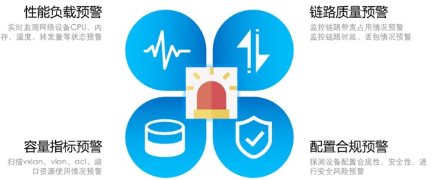对设备各种性能负载情况、容量指标情况、网络带宽情况进行综合检测分析,形成网络健康分析报表;对潜在风险和网络DDoS攻击等进行预警。当性能容量出现被攻击或业务瓶颈时,控制器可智能的进行预警和提供扩容建议。
